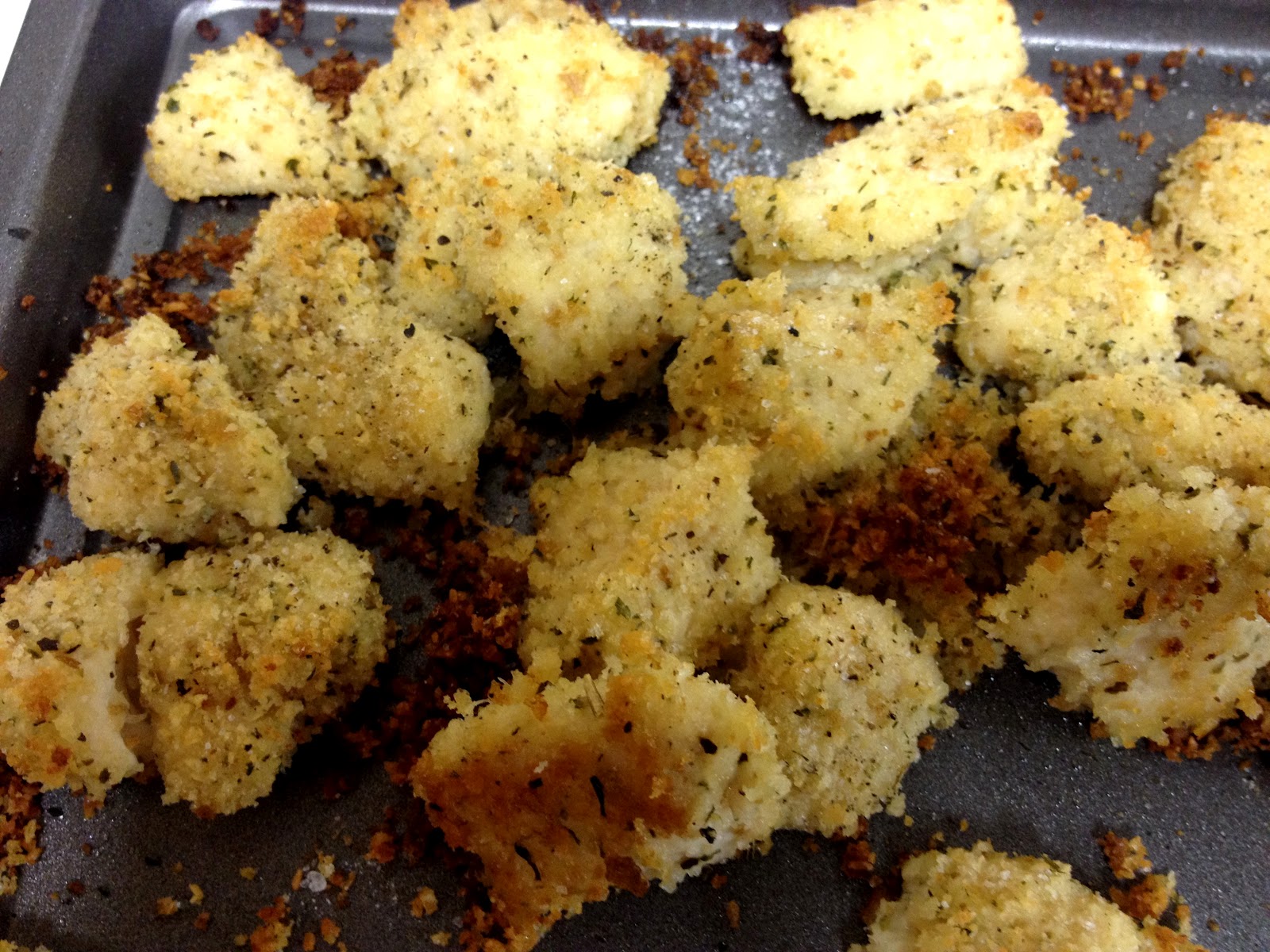Preheat oven to 425 degrees. Spray a shallow 13 x 9 baking dish (I used a small cookie sheet) with olive oil spray. Pour 2 Tbsp extra virgin olive oil into a small mixing bowl. In a large zip top bag (or bowl if you don't have bags), mix together bread crumbs, parmesan cheese, parsley, salt and pepper. Place chicken pieces into olive oil and toss chicken to evenly coat. Drop oil coated chicken into bread crumb mixture and coat each side shake in the bag making sure each piece is coated with the crumb mixture. Place all of the coated chicken pieces onto oil coated baking sheet then sprinkle remaining bread crumb mixture over chicken pieces. Bake in center of preheated oven for 10 minutes, then remove from oven, rotate chicken pieces to opposite side and bake an additional 5 minutes (I actually didn't do this step. I just rotated my pan in the oven).